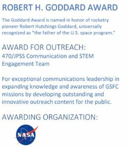GAMA-1 Technologies, Josh Brady, and his Joint Polar Satellite System (JPSS) Communication and STEM Engagement Team members were nominated and selected to receive a Robert H. Goddard award.